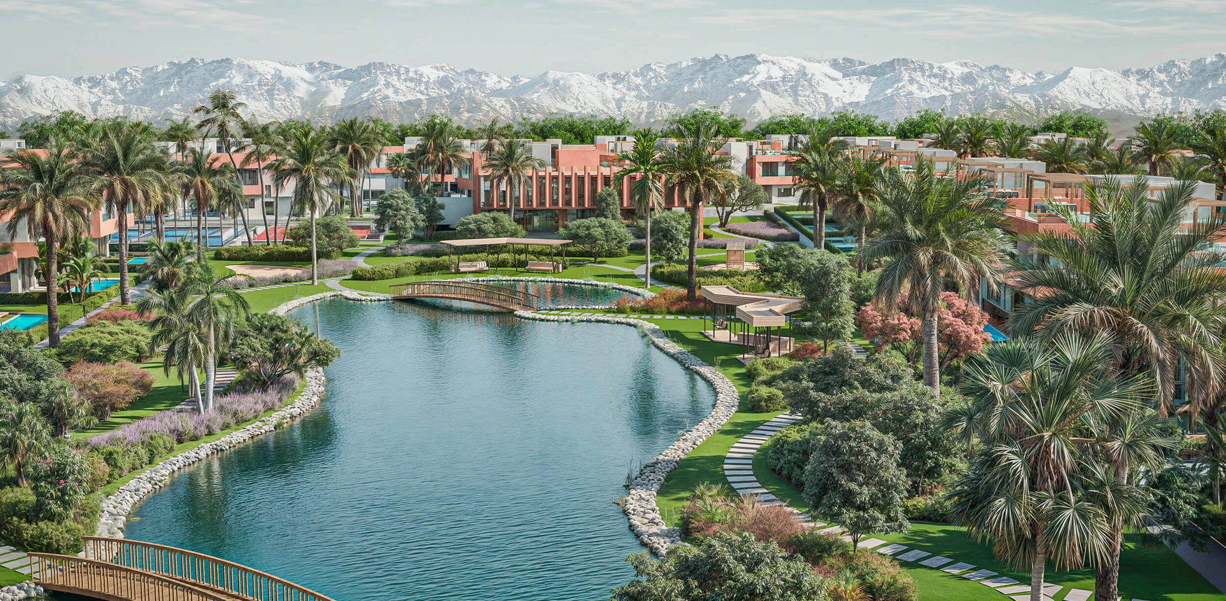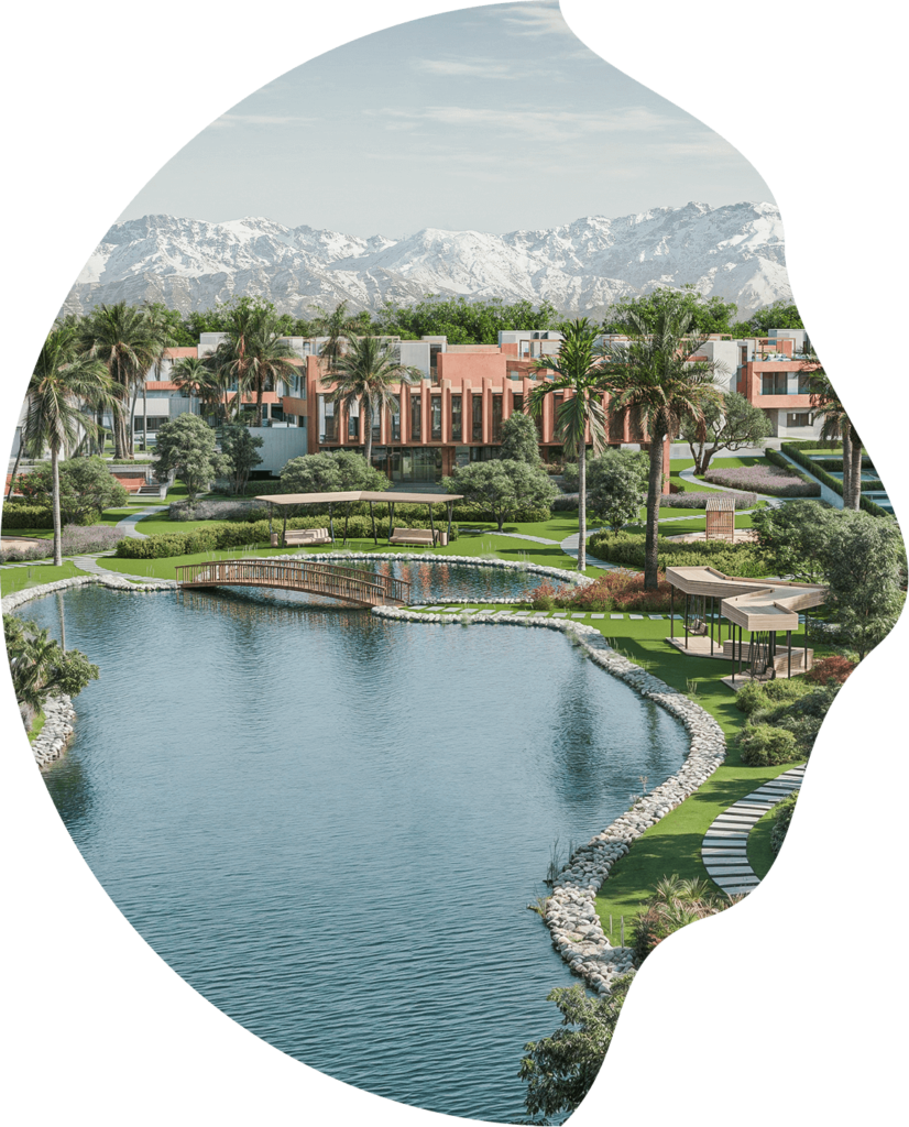 Portée par une équipe passionnée, la démarche s’articule autour d’un concept fort, mêlant urbanité, qualité de vie et cœur paysager central, véritable passerelle entre intérieur et extérieur. Dans ces villas, les espaces verts, le lagon et les montagnes de l’Atlas s’invitent avec élégance dans votre quotidien.